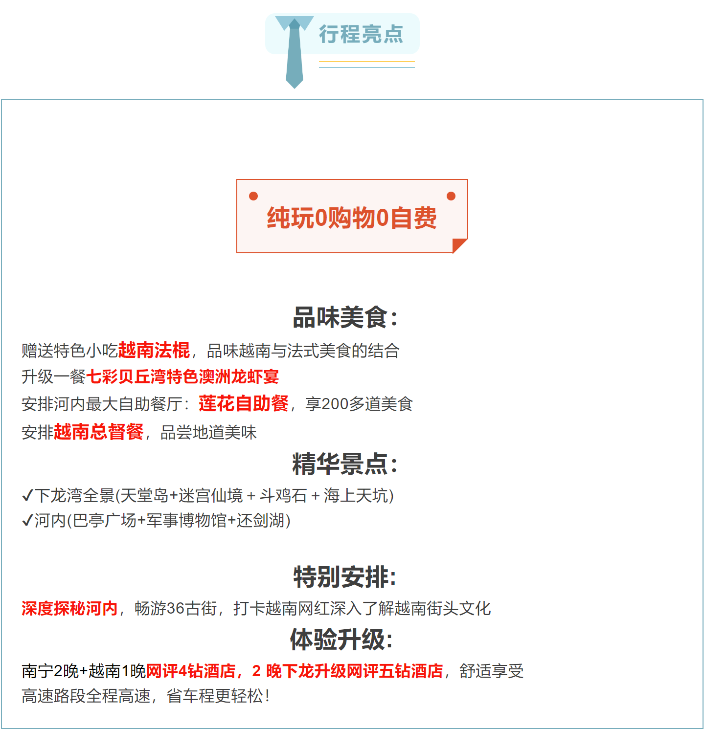 早餐后前往巡州岛度假区、欣赏海岸风光 , 后乘越南特色红木游船漫游世界八大自然遗产之一的“海漫游世界八大自然遗产之一的“海上桂林”, —下龙湾 (游览时间约 4H) (在 1500 多平方公里的海面上、耸立着 3600 多座大小不一、千姿百态的喀斯特地貌的山石、更以其“海美、 山幽、洞奇”三绝而享誉天下) ——观狗爬山、香炉山、 斗鸡山等数不胜数的风景尽收眼底,再从斗鸡石出发游览下龙湾的精华景点之一【迷宫仙境】 ,船上独家安排特色热带水果大餐,随着游船观赏一座座的独立仙岩 (大拇指山、青蛙山、天鹅山) 等千姿百态的景色。午餐安排于船上进行用餐,下龙湾亦有小渔船如影相随,把酒临风,去国怀乡之忧荡然无存,在天海一色中的游船上大快朵颐的美妙感觉在您的全身悄悄蔓延。