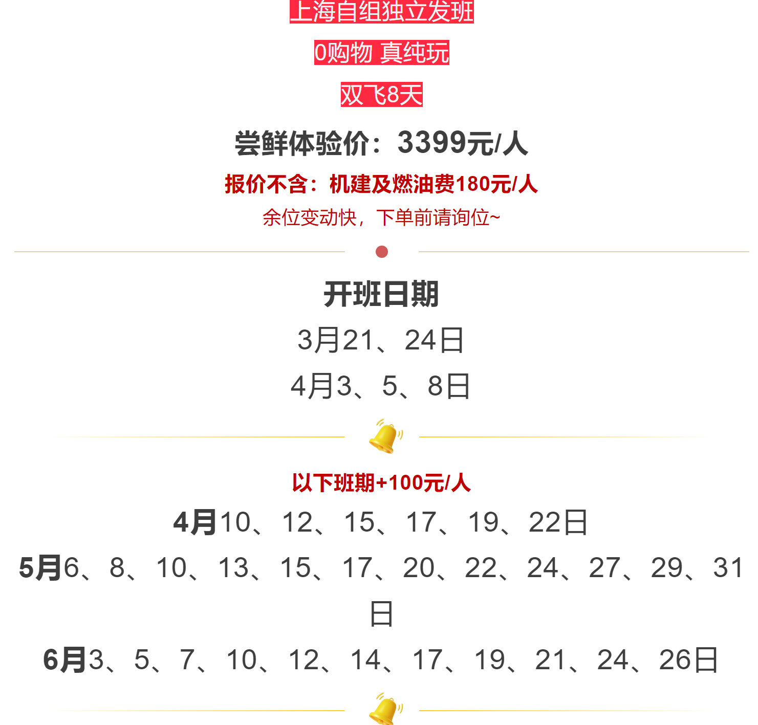 一、机建燃油费180元/人(必选,价格如有浮动以航空公司出票价格为准!)