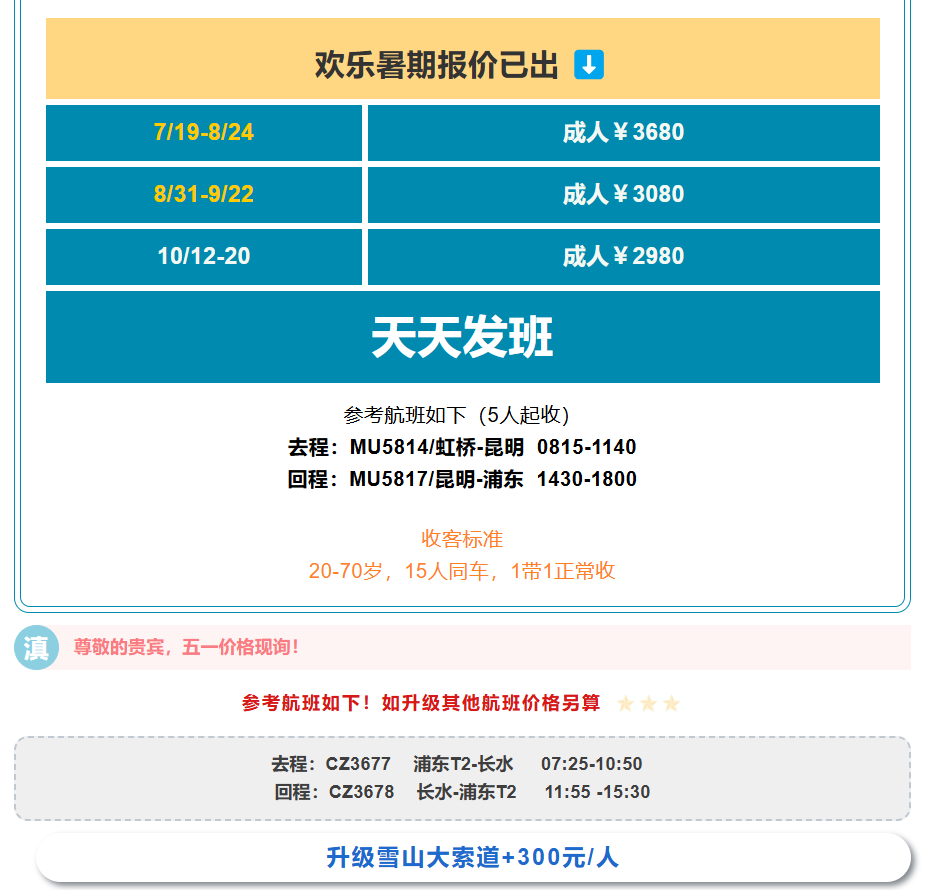 之后乘车前往丽江,出团前根据游客自身身体情况自愿选择: A玩法:玉龙雪山大索道→蓝月谷;B玩法:玉水寨+以及解锁雪山大片