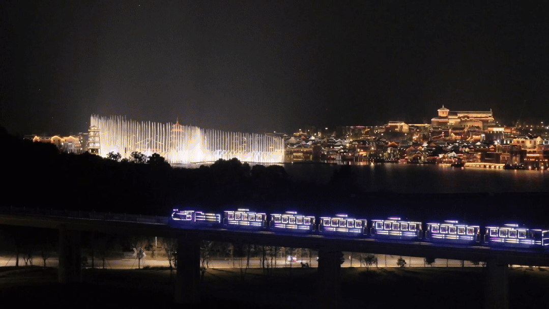 小火车悠悠穿行其间、与湖中摇曳的摇橹船相遇