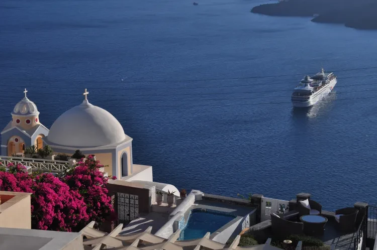 蓝白小镇边的爱琴海沙滩沙质细软金黄,坡度平缓,呈半月形伸展。就像一架钢琴横卧在海上。