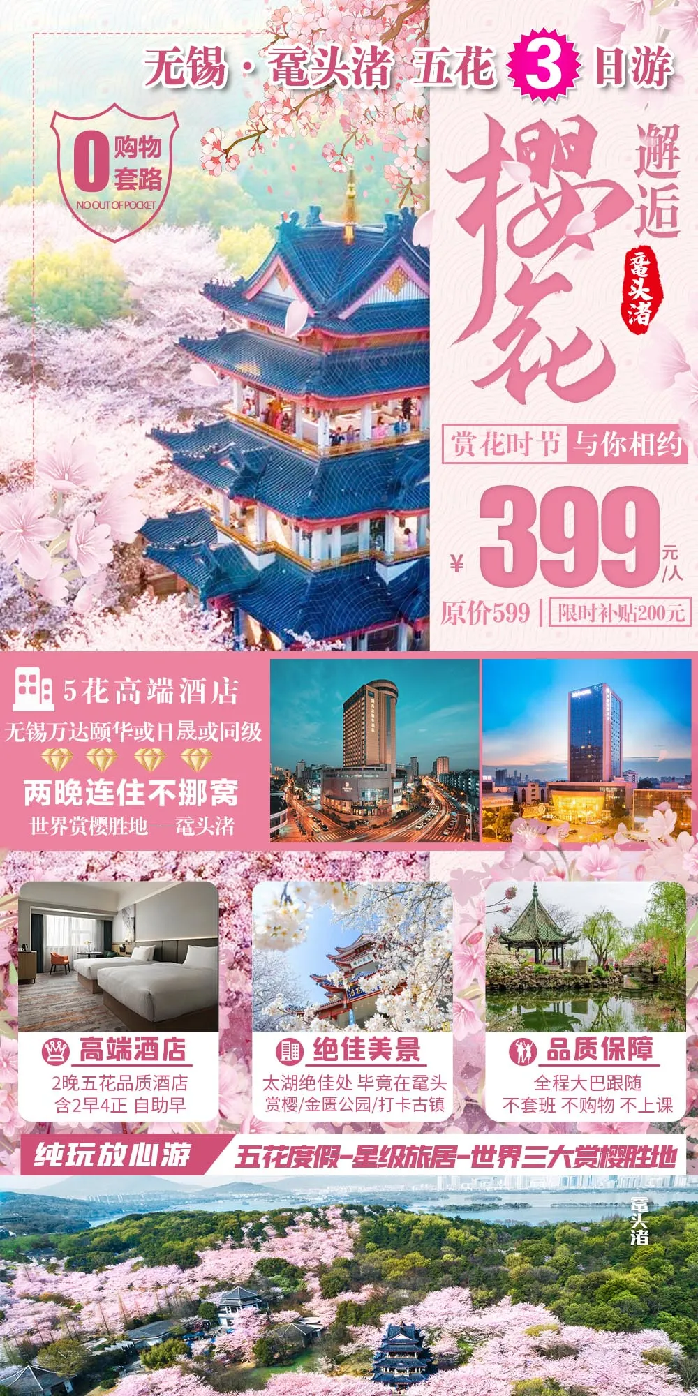 因樱花季为无锡旅游旺季,团队爆满,行程所列酒店只做参考,不可指定酒店入住,旅行社会根据当天酒店实际情况做灵活安排,具体酒店以当天实际入住为准!谢谢配合!