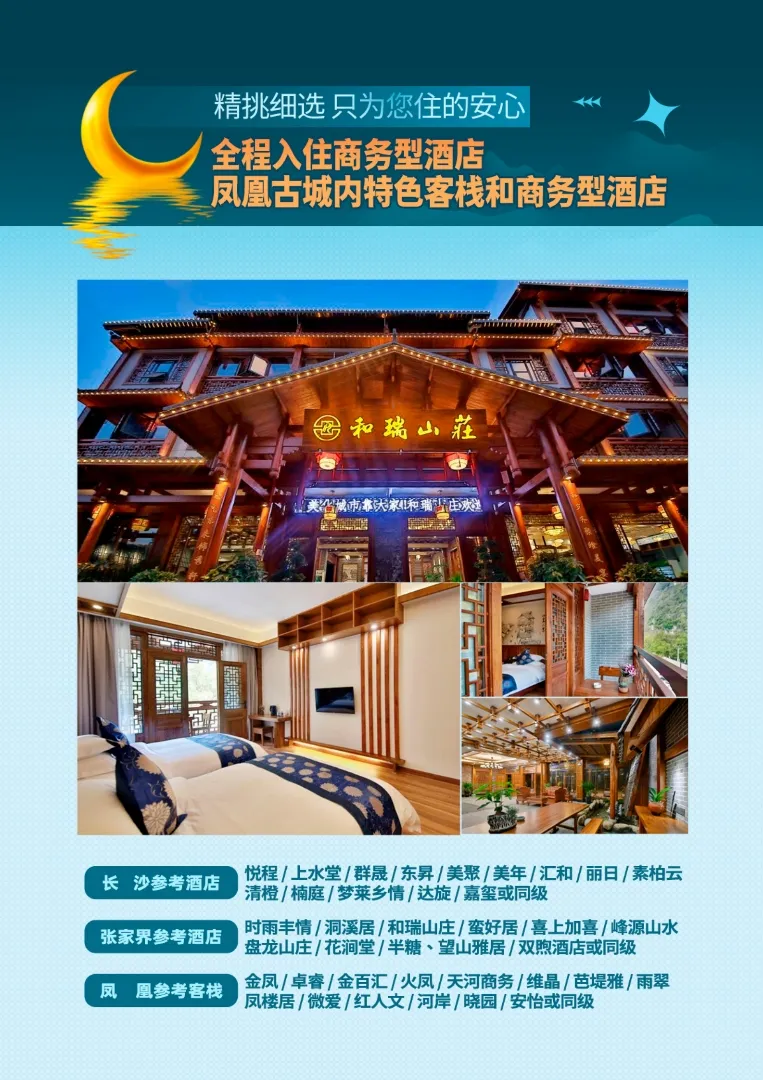 今日可早出发欣赏【凤凰晨景】,凤凰古城曾被新西兰著名作家路易·艾黎称赞为中国最美丽的小城,了解凤凰的风水宝地,感受清明时期的建筑设施,了解先辈们的文化之精髓......欣赏悠悠沱江水,翩翩吊脚楼,漫步凤凰古城民族风情工艺品一条街,可逛网红打卡地翠翠街(苗家人谈情说爱的地方),还原翠翠的故事,让您身临其境的感受沈从文的边城。深入了解中国非物质文化遗产-----苗银纯手工锻造技艺,了解先辈们的文化之精髓,在古城内可免费品尝着沁人心脾的苗家姜糖...一种远离尘世的感觉悠然而生;一幅江南水乡的画面便展现于眼前,这一切都使人留连忘返......前往张家界入住天子山风情小镇,这里四面环山郁郁郁葱葱,清澈的溪流让你心旷神怡,门前的小溪清澈见底,陪着自己的孩子在溪水里抓螃蟹抓鱼抓虾的同时找回自己儿时的快乐回忆!
