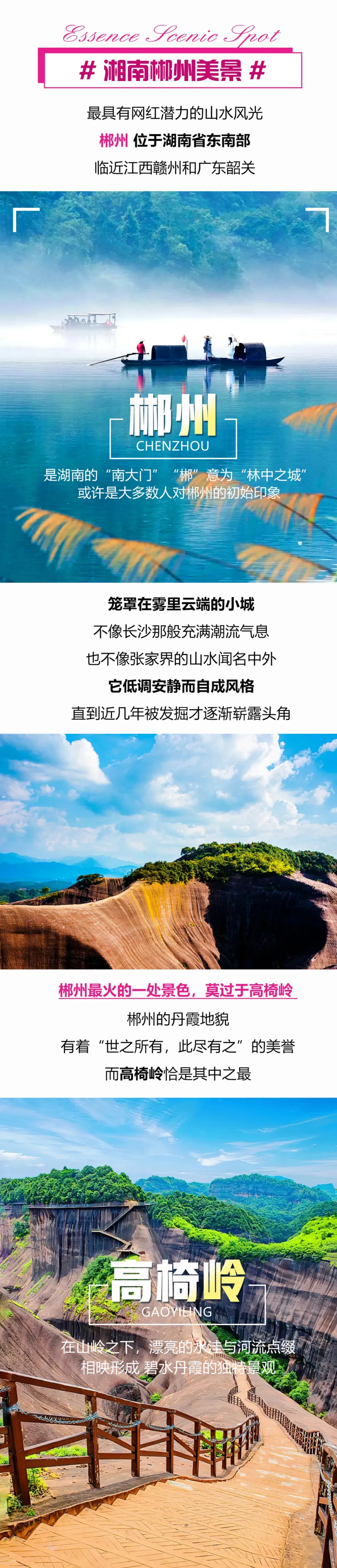 早餐后前往游览【高椅岭风景区】(开放式景点,游览时间约2小时):高椅岭位于湖南省郴州市苏仙区境内,郴江、东江交汇于此,形成享誉江南的翠江风景带,以丹岩堡寨为特色,穿坦、洞穴为罕见,近年来备受驴友推崇,“简单”介绍,高椅岭丹霞地貌之“美”,不仅美在山水相融、树石相间、犬牙交错、大气磅礴、惊而不险,更美在墨绿色的“天池”环绕着一只在水面张牙舞爪的“巨蜥”。