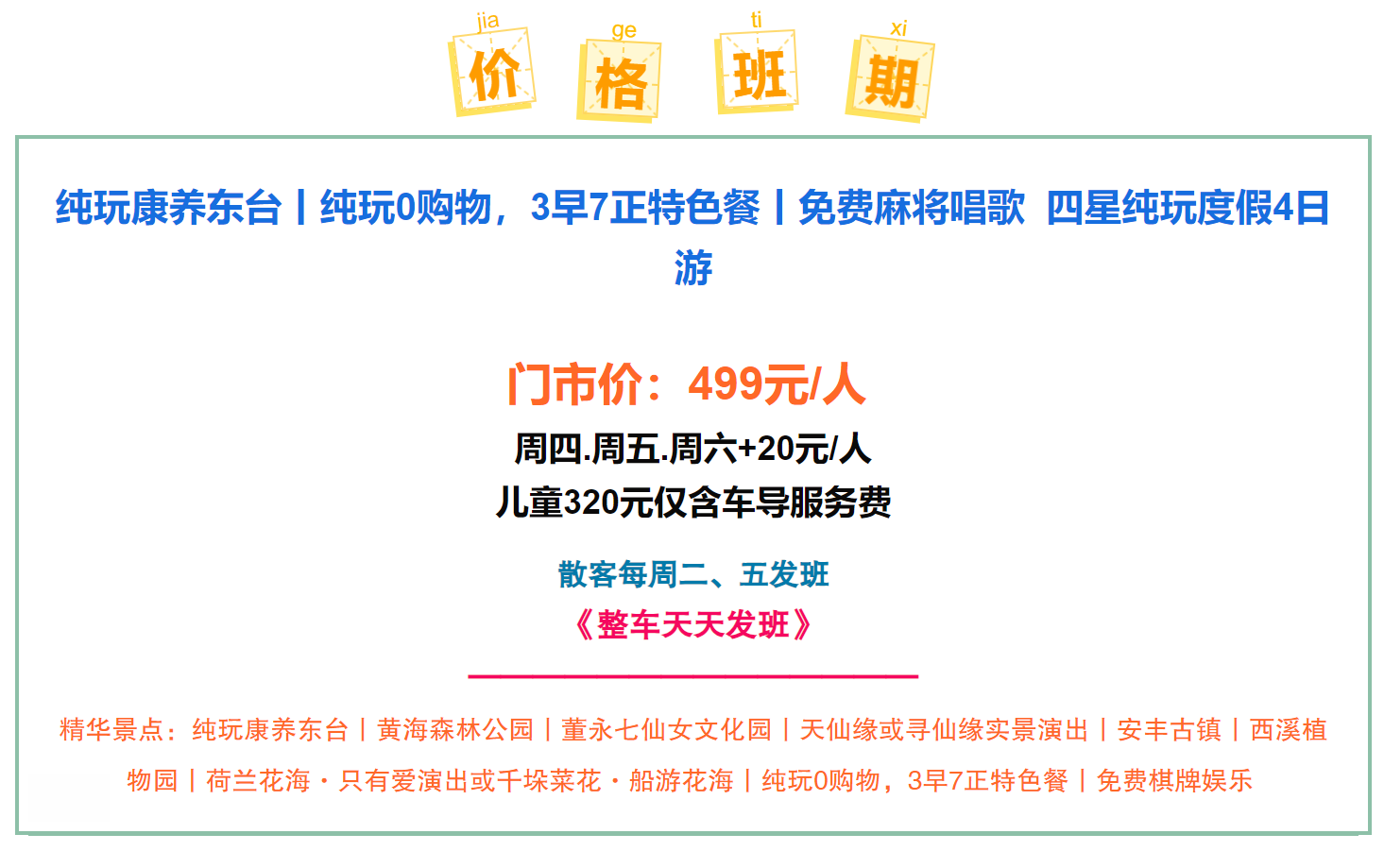 3.导游通知:导游将于出团前一日16:00-20:00短信或电话通知,请游客确保手机号码准确并保持通畅。