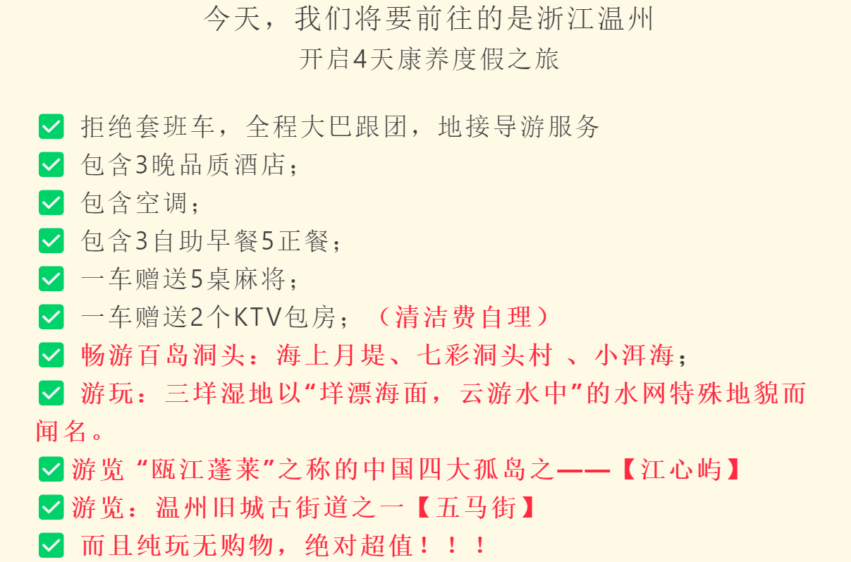 17、★此线路为特价活动线路,故老年、儿童、妇女等特殊人群不再享受优惠。本线路按签约先后顺序排座位,不受理尽量靠前的特殊需求,收客较少时,可能与同方向其它线路拼车,不便之处敬请见谅;为了游客的出行安全,接上海市旅游局相关会议要求,每个出行游客必须提供真实身份信息,出行携带身份证件。