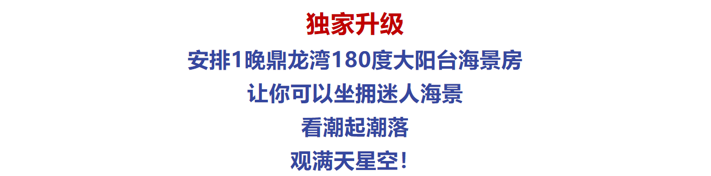 后游览【德萨斯牛仔小镇】头戴宽沿高顶毡帽、身着牛仔裤皮上衣、足蹬一双饰有刺马钉的高筒皮套靴,在马背上驰骋……美国西部牛仔们自由自在的生活方式让不少人向往。游客们可自行前往【情人沙滩风情街】,被誉为“好友相聚街”,同事相聚这里,白天可以在沙滩上来一场沙滩摩托,享受速度与激情;游览【鼎龙湾沙贝绿道】在运动中呼吸满满鲜活负氧离子,为健康养生助力、【高尔夫大道】、【万千海礁石群】、【石狗福道】网红打卡点,石狗是粤西雷州人民时代繁衍生息中遗留下的宝贵文 化,堪称南方“兵马俑”、牛仔小镇往海之角走的话,一定要会经过『北纬 22°情侣邮局』,那里有一面超级上镜的墙,墙上有个超大的爱心,组成了『 I ♥ LOONGBAY』的“网红打卡墙”!!就只有千篇一律的海景照片吗?不,你还可以拍出野营风!在“龙虾广场”的大草地上不仅有广阔的休闲场地,还有千奇百怪的动物塑像,最突出的莫过于有两三层楼高的大龙虾了。入住鼎龙湾180度海景房。