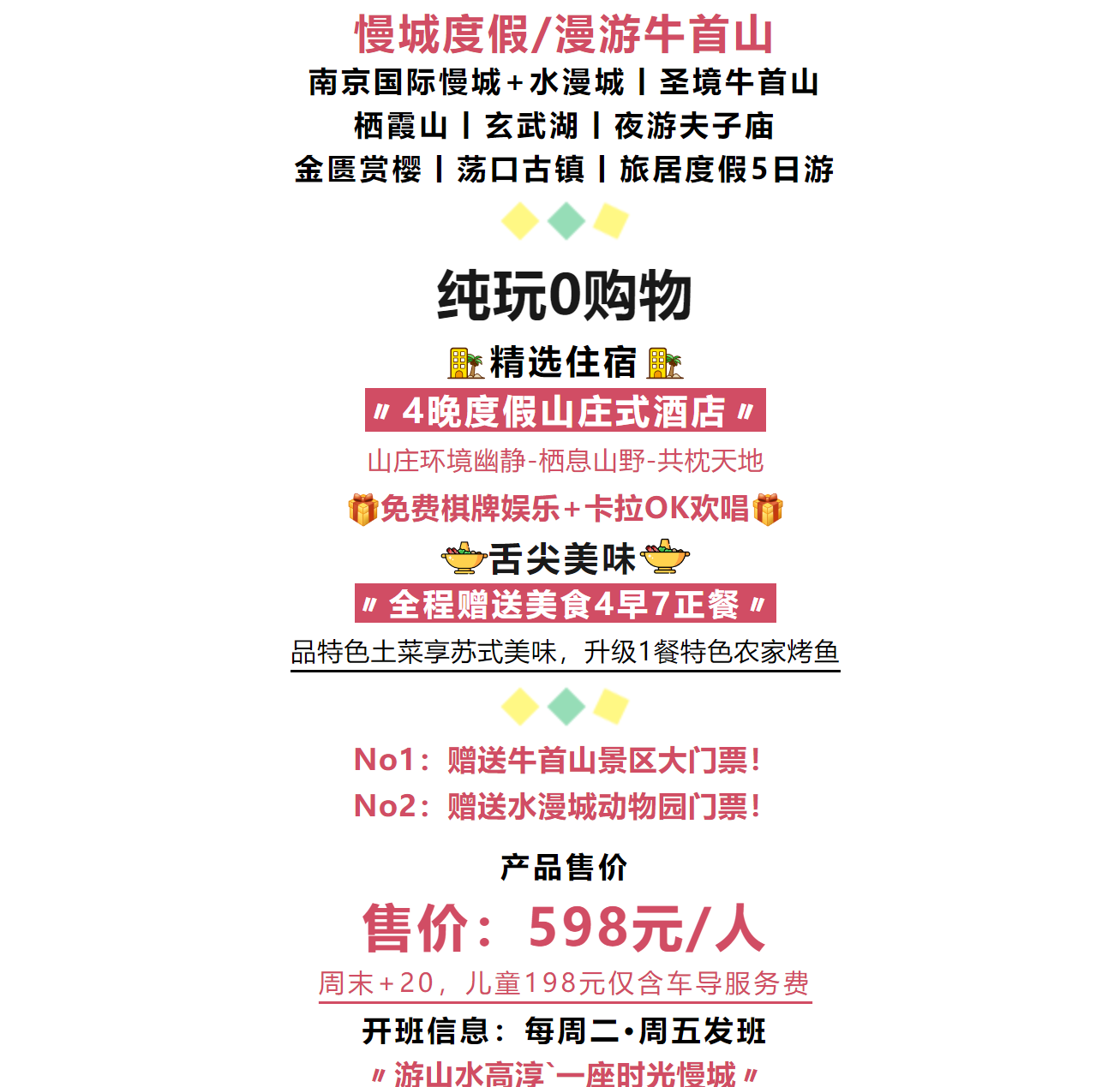 早上6:40人民广场武胜路·或其他指定位置出发前往南京。【牛首山】·50周岁以上送门票;50岁以下补30元;牛首山是金陵四大名胜之一,素有“春牛首”之美誉,金陵四十八景中有三景(牛首烟岚、献花清兴、祖堂振锡)缘聚于此:牛首山还遗存岳飞抗金故垒、摩崖石刻、弘觉寺塔、郑和文化园等历史古迹。牛首山佛缘深厚,法融禅师开创的牛头禅宗发祥于此,2012年,世界佛教界至高圣物——释迦牟尼佛顶骨舍利于南京盛世重光,长期供奉佛顶骨舍利,牛首山景区的主题是“禅”;到达【牛首广场】(进入“富有禅意的门”);沿着含有春、夏、秋、冬主题游览的【天阙路】到达【佛顶寺】(佛顶寺是佛顶宫舍利护持僧团的弘法道场);参观【佛顶塔】;外部观景并进入【佛顶宫】(佛顶宫是佛顶圣境的核心建筑,整个佛顶宫以佛祖顶骨舍利供奉为核心,共分为大、小穹顶两个部分,其寓意为外供养与内供养);适时集合前往山庄,晚餐后自由活动,免费棋牌(满10人赠送1场),免费唱歌轮流预约!