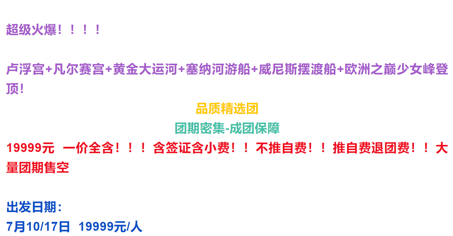 所含景点首道门票(其余景点均为外观):卢浮宫(含门票含耳机讲解)、凡尔赛宫含门票(含耳机讲解不含后花园)、塞纳河游船、黄金大运河快艇、少女峰含门票缆车、摆渡船上岛