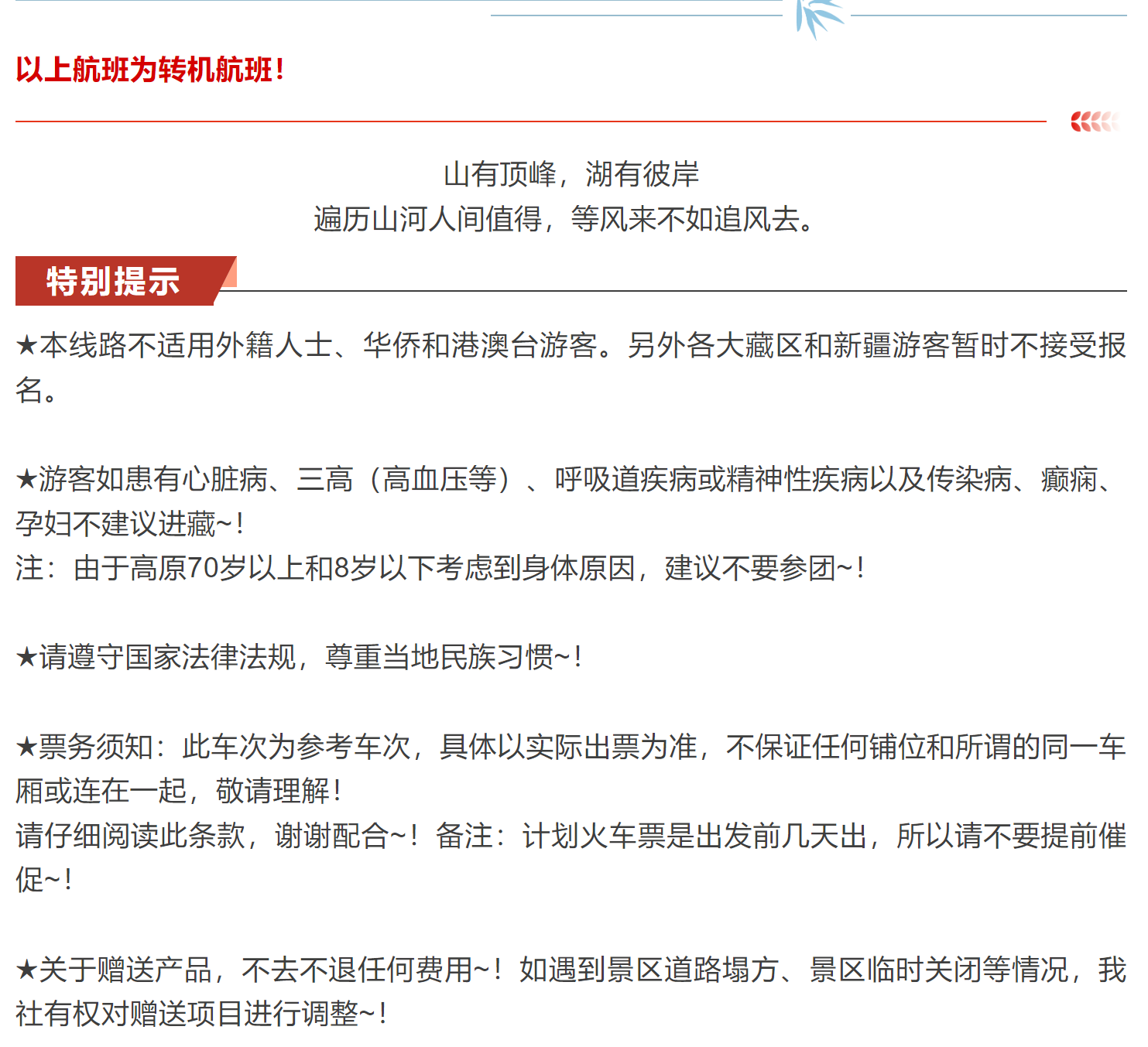 13、5岁以下和69岁以上的游客、失信人员、台湾省、外宾等预定此产品请提前告之。