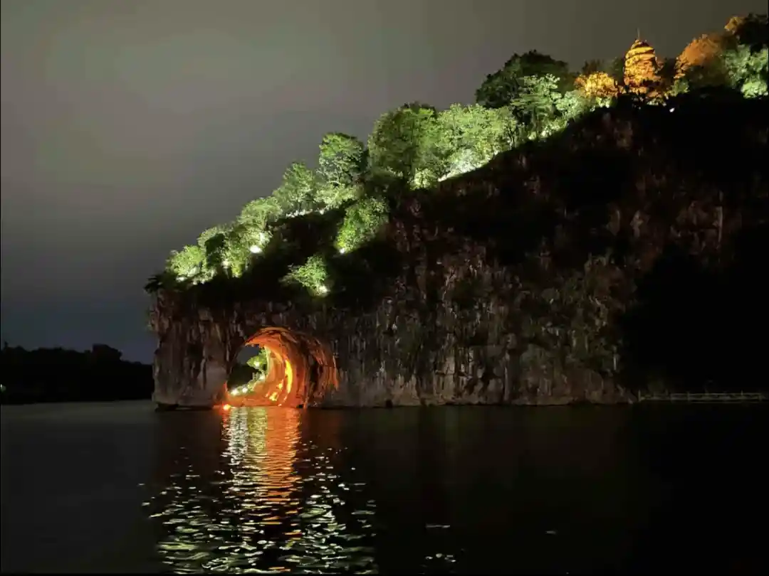 乘船游览桂林市山水代表、城市象征城徽,其山酷似一头驻足漓江边临流饮水的大象,栩栩如生,引人入胜,山体前部的水月洞,弯如满月,穿透山体,清碧的江水从洞中穿鼻而过,洞影倒映江面,构成“水底有明月,水上明月浮”的奇观。