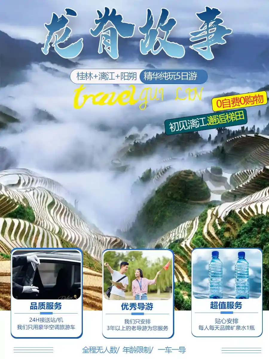游览有“世界梯田之冠”的美称【龙脊梯田】(游览时间约90分钟);龙脊梯田位于广西龙胜各族自治县和平乡平安村,梯田有鬼斧神工的造型和如诗如画的意境。曲线优美。其线条行云流水,潇洒柔畅;其规模磅礴壮观,气势恢弘,有“梯田世界之冠”的美誉。观赏【平安寨】属于龙脊梯田的一部分,有“七星伴月”和“九龙五虎”两大著名景观,景色秀美飘逸。