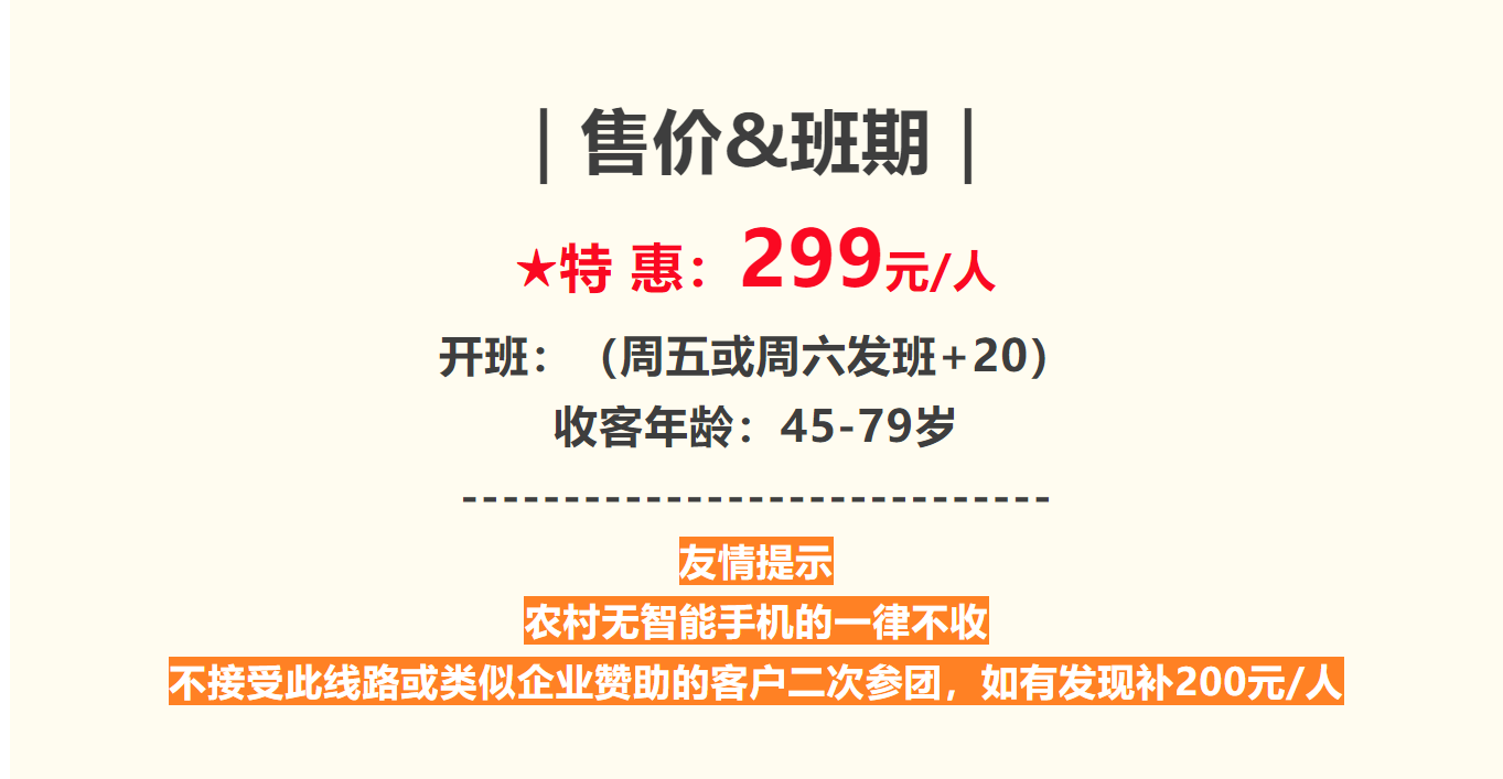 ★收客年龄50周岁-79周岁,此行程为补贴线路,不在此年龄段 +200元/人,儿童不收
