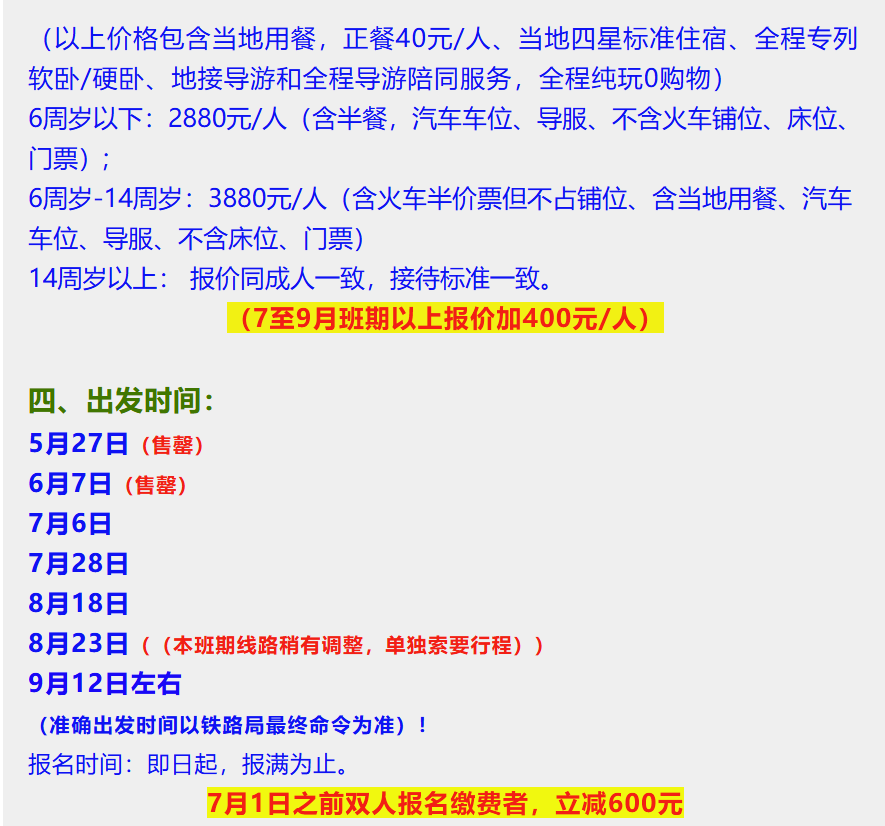7、门票:所有景区门票及景区内交通未含,火车上交予导游,多退少补。旅游途中如因身体原因或其他特殊情况,未产生的景点门票费用在返程专列上由导游退还。下表各景点门票价格按2024年参考,门票及老年优惠政策以景区当天实际价格为准,届时多退少补;具体景区以实际游览为准。门票60周岁以下1682元,60-64周岁1157元,65-69周岁705元,70周岁以上533.5元;