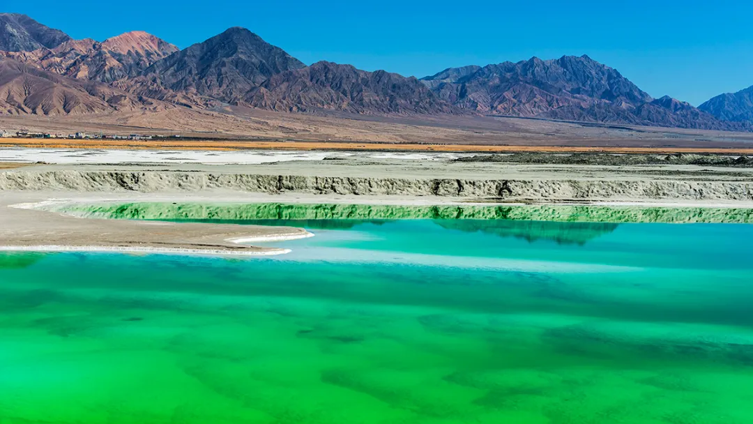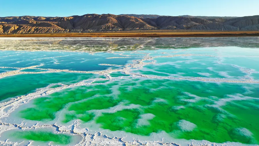 天然盐湖形成自然景观,湖水颜色如翡翠般美丽