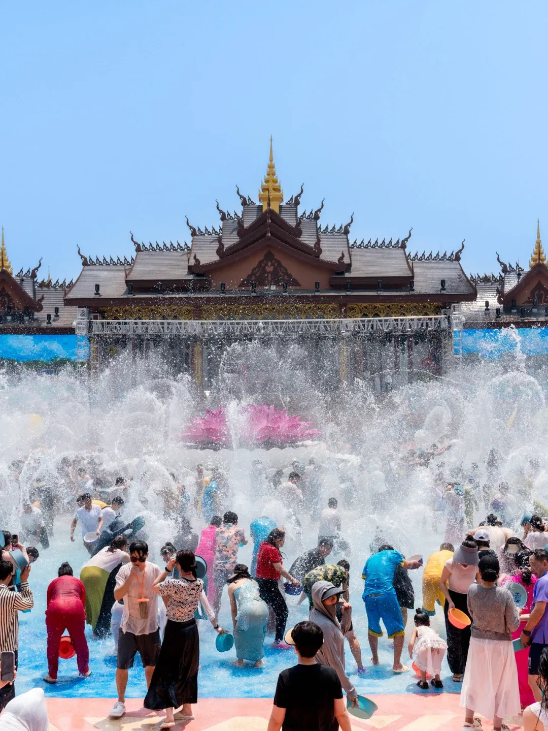 后乘车游览参观西双版纳傣王的皇家寺院—【勐泐大佛寺】(单程电瓶车40元/人自理)(尊享 VIP 通道,不排队零等候)(景区内的商业板块与旅行社无关)佛寺是在古代傣王朝的皇家寺院“景飘佛寺 ”的原址上修建的,以佛祖释迦牟尼的生平及佛 寺活动为主线,九龙浴佛、景飘大殿、神石、国殿、吉祥大佛等有500多座佛寺、200 多座佛塔。而勐泐大佛寺是所有佛寺中最大的,地位也是是至高无上的,是傣家人心目 中的圣地,成为世界南传佛教的文化中心。今日独家资源特别安排:《神石祈福》据贝 叶经记载,这块大石出现在一个雷电交加,风雨大作,大地震动的夜晚,而附近村寨的 居民一直把它当作天降神石祭拜。在第二年,佛祖坐在此石上休憩为四处赶来的百姓讲 经说法。佛祖指着当时澜沧江和流沙河泛滥的坝子,留下预言:将会有一个帕雅(傣王)管理并繁荣这个地方,佛法将在这里从此光大昌盛……根据时间可观千只孔雀放飞盛景。参与傣家泼水活动祈福“泼湿一身,幸福终身 ”