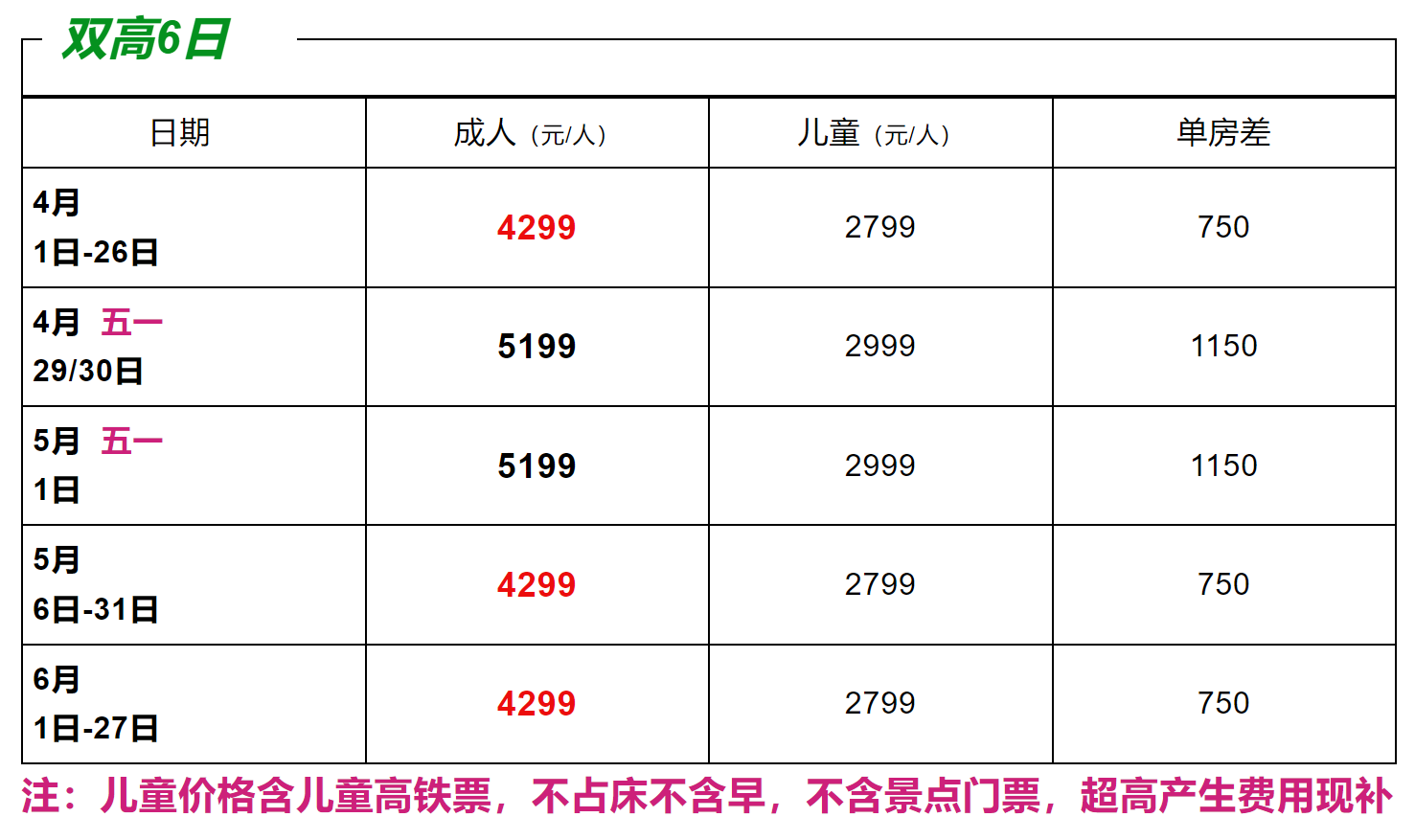 门票:不含门票,65周岁岁以上免门票,65周岁以下客人需补门票470元/人