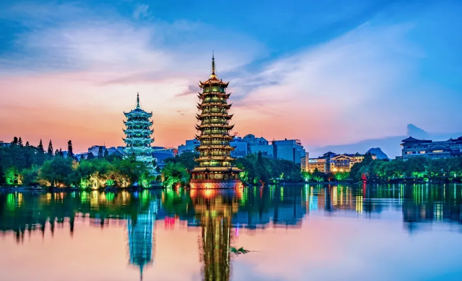远观【日月双塔】, 日月双塔地处桂林市中心区,坐落在桂林城的中轴线上,与“象山水月 ”相邻。 日塔通体 均为纯铜装饰,整座铜塔创下了三项世界之最--世界上最高的铜塔,世界上最高的铜质建筑物,世界上最高的水 中塔。象山是桂林的城徽,而双塔则是新桂林的标识。 日塔、月塔与象山上的普贤塔、塔山上的寿佛塔,相互呼应,相互映衬,有“ 四塔同美 ”之说。