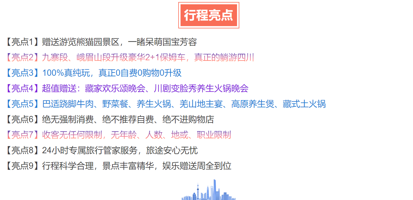 1.不含九寨沟观光车90元+景区意外保险10元、黄龙索道上80元下40元 (建议最多只乘坐单边),保险10元,观光车20元/人,黄龙卫星定位器30元/人,熊猫园观光车30元/人,不含峨眉山观光车90元/人、金顶往返索道120元/人,万年寺上行索道65元/人、万年小门票10元/人、乐山大佛摆渡车20元单程,30元往返,以及索道保险,猴区保险等;都江堰30元/人;青城山观光车30元/人;