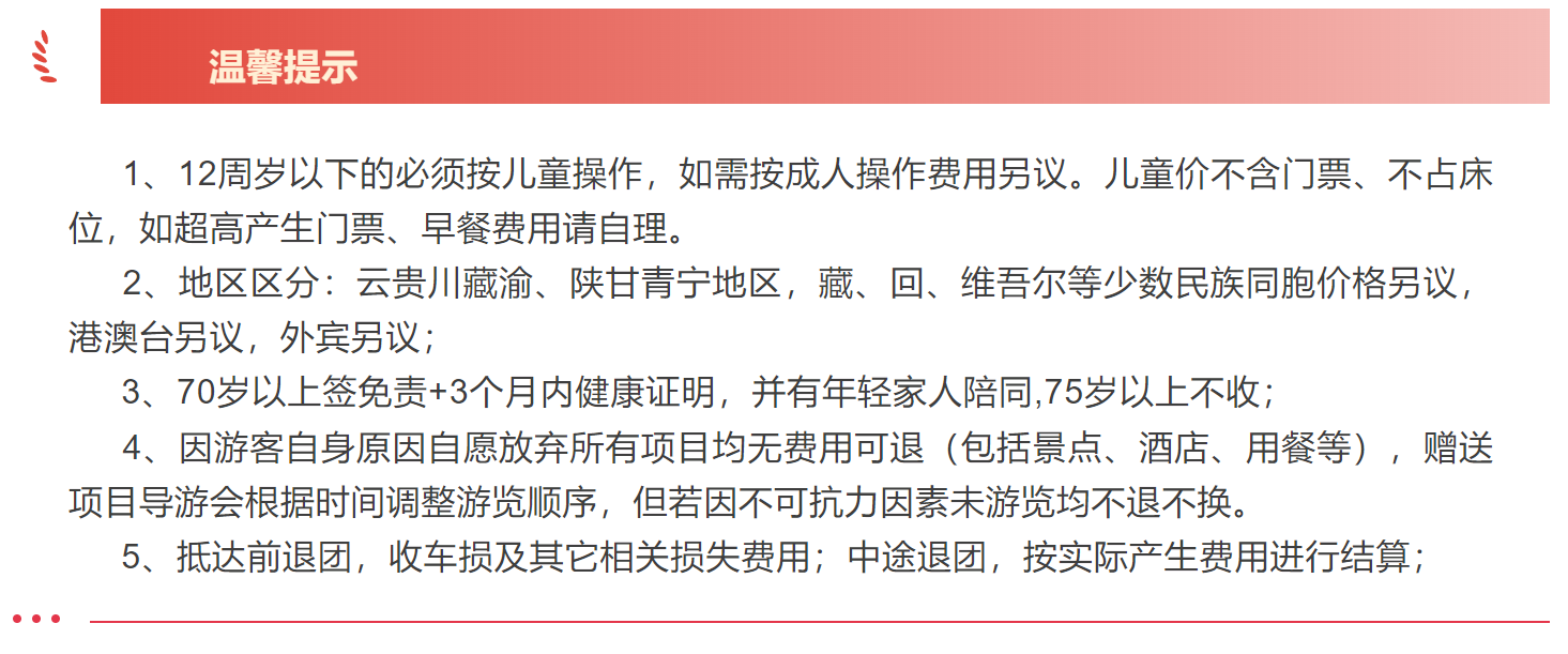 赠送项目:赠送项目均为我社为品牌建立,突出行程特色的促销回馈行为,为我社无附加条件赠送,赠送实物均不会取消,赠送游览体验正常情况均会前往,但如遇特殊原因(如天气,路况,时间等)未抵达或变更均由我社根据实际情况合理安排,不退费,亦不等价折换其它,此赠送仅包含成人。