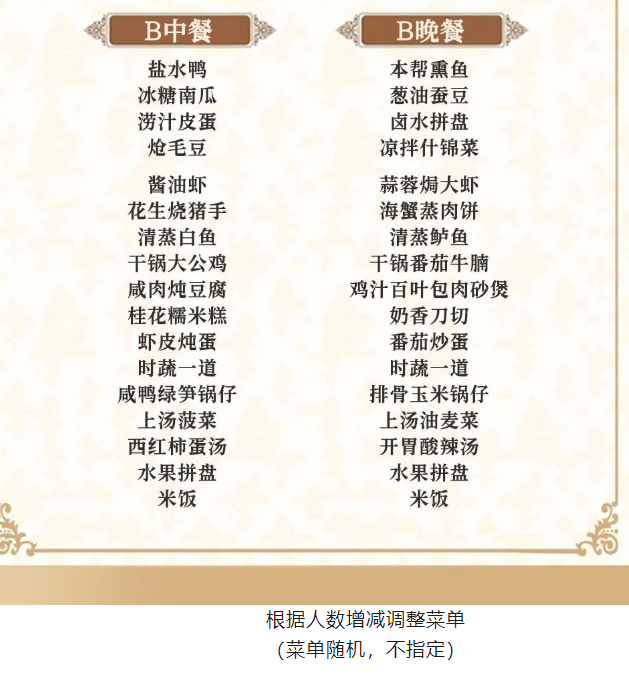 ★如遇到部分家庭6-9人单独安排一桌年夜饭,下单时需补齐相应差价218元/人(6人安排一桌需补差218元*4人,8人安排一桌需补差218元*2人,以此类推);其他正餐按照人数增减菜品!