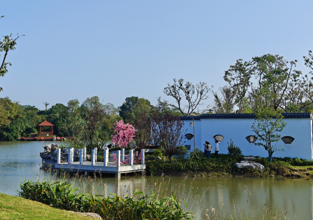 桃花岛景观公园以桃为主题,揉合了英式和江南园林风格。公园由两个大岛屿和三个小岛组成,园内亲水平台、休闲景观亭、景观喷泉、景观植物相互映衬。