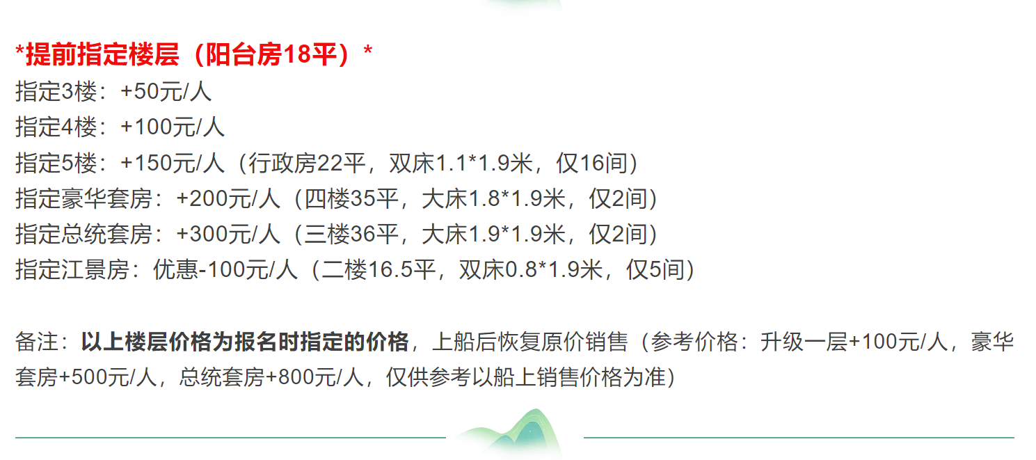 4、住宿:游船2晚基础阳台标准客间;(游客如需要升级楼层从2楼算每升一层楼+50元/人,最高升到5楼),宜昌、重庆各1晚网评四钻酒店住宿,酒店含早餐;游船上2晚单房差1500元/人,陆地2晚单房差300元/人。备注:若升级酒店,房差按实际酒店费用另外核算;