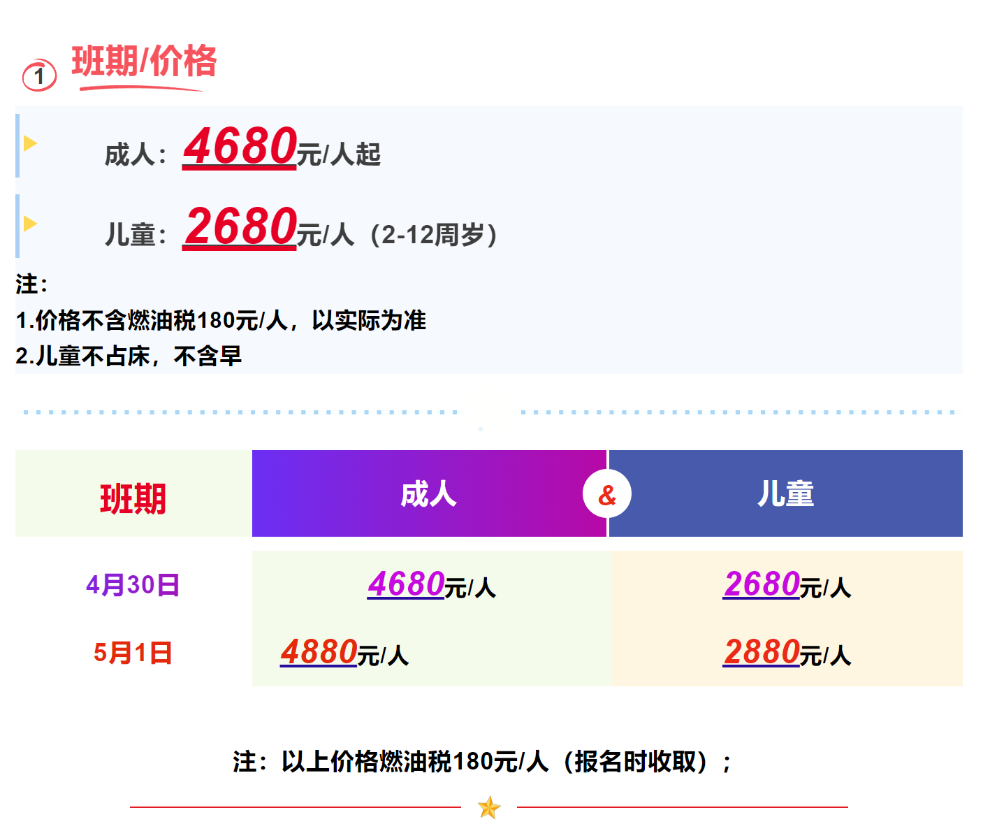 1、本线路为节日买断资源产品,飞机班为航空切位,报名需支付2000元/人定金留位,在报名确后,游客因自身原因无法成行,定金不退,其他费用(包括地接费用)按实际已产生的多退少补,请知晓;