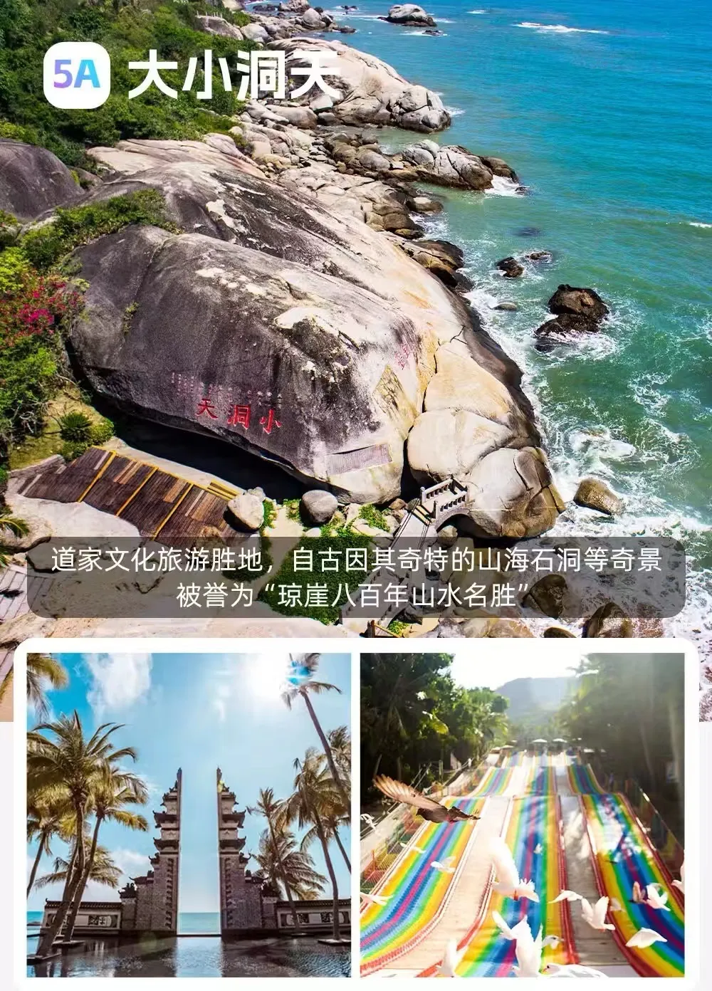 早餐后前往【分界洲岛】参观蔚蓝大海中的一座苍翠岛屿、放逐心灵的世外桃园分界洲岛眺山海奇观,觅心灵归隐,岛上绮丽的原始自然风光、清澈见底的海水,带给你肆意放飞心情的欲望(游览不少于150分钟),继续前往【大小洞天】5A级旅游名胜景区,中国最南端的鳌山之麓,南海之滨,也是中国最南端的道家文化旅游胜地,自古因其奇特秀丽的海景、山景、石景与洞景被誉为“琼崖八百年第一山水名胜”。 道出了南山与福寿文化的悠久渊源,是礼佛祈福的佳选之地(游览不少于90分钟)
