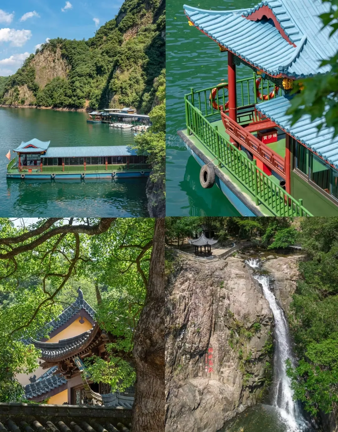 五级瀑布。乘景区班船到达对岸,沿小径步行,穿幽深峡谷、繁茂树林,越唐代修建的五泄禅寺,过东湫阁竹亭,拾级而上,便可听到瀑布的声响。这声音虽然不是震耳欲聋,却也气势非凡。顺着声音走去,眼前便出现一道瀑布,从十几米高的山崖上冲泄而下,似白练倒悬,入水处白沫飞溅,如雪似乳,一潭清水荡漾在岩壁下。