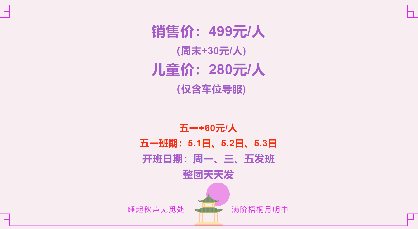 ◆旅行社退团赔付:散客拼团线路满35人开班,如未成团提前3天全额退款不做赔偿!