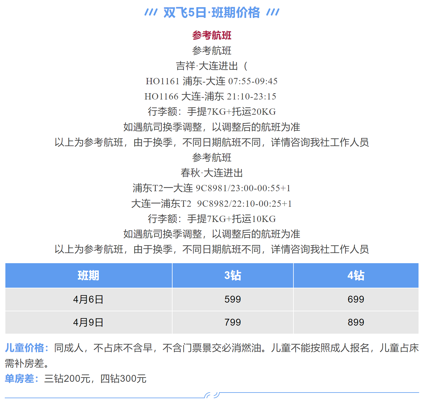 9、此行程单不保证具体的航班号及航班时间,仅保证行程安排,具体航班以出团前确认为准。火车票不保证车次铺位等特殊要求,机票需游客自行值机选座。