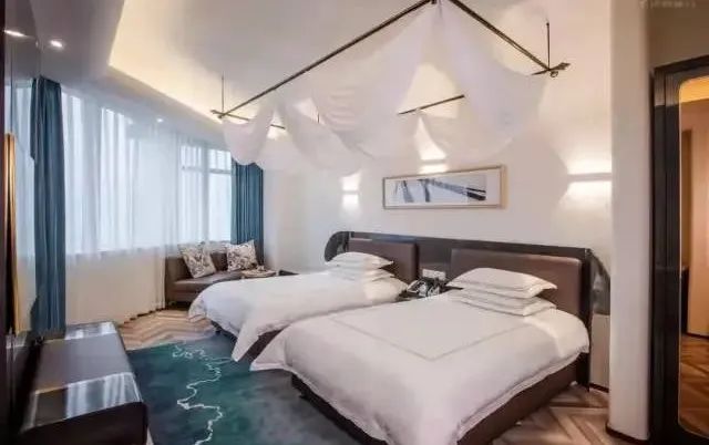 客房的线条柔和,在简约现代的风格中,融入了东南亚元素,白色的纱幔起到了画龙点睛的效果。暖色系的床品搭配水墨中国风的抱枕和床巾也毫不违和。