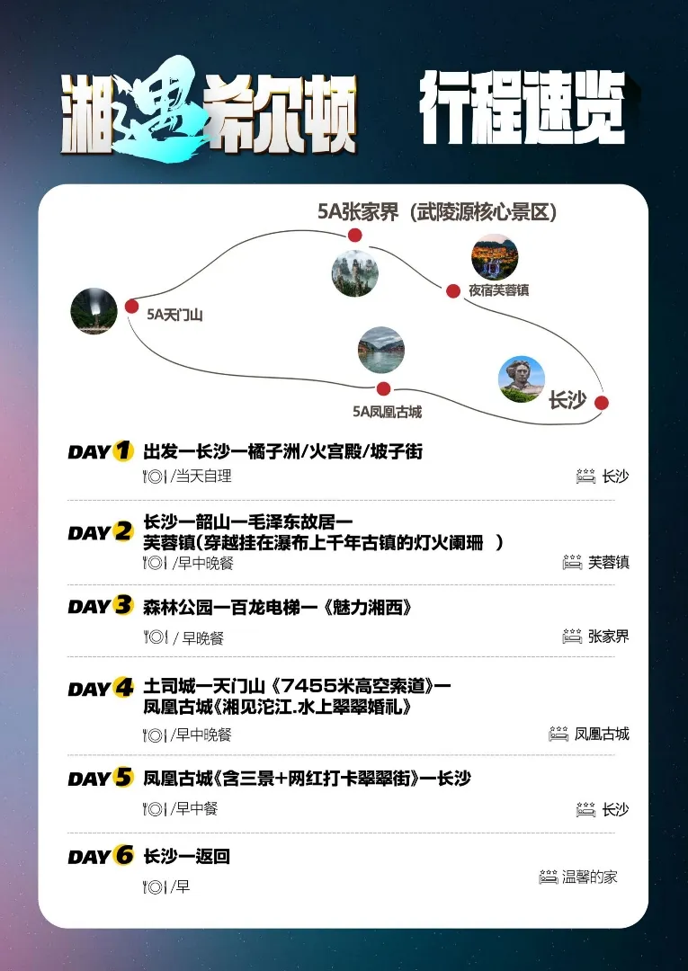 5、当天抵达长沙的时间很晚啦(22点以后),如遇景区/路途中不可抗力的原因有可能会更晚,如有当天返程的建议出23:30分以后的火车或者增加一晚长沙住房。如因不可抗力的原因导致无法按预期的时间抵达返程的费用由客人自理