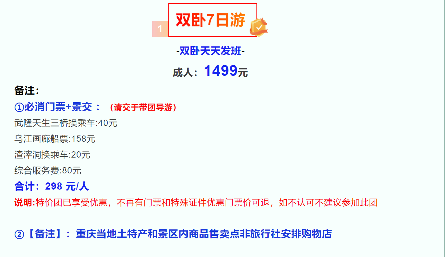行程不含景区门票+景区内交通车:武隆天生三桥换乘车 40、乌江画廊船票 158、渣滓洞换乘车20、综合服务费。合计:必须消费298 元/人(本次行程为优惠团,无门票和优惠证件可退)此费用需要游客落地后交由导游统一购买。