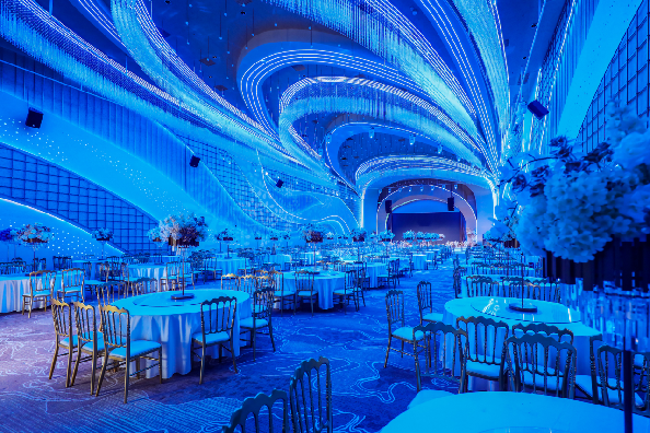 酒店婚礼艺术中心拥有星云秘境、幽蓝水晶、绮罗花园和流光幻梦四个主题厅,最大单厅可容纳50桌。同时酒店利用自然环境优势还可举办草坪婚礼,可满足新人不同形式的婚礼需求。