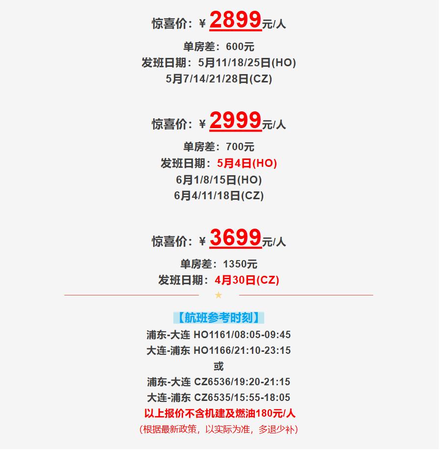 2、往返机建及燃油税180元/人,报名时一同支付(根据航司最新政策,如遇政策调整,实际以出票当天为准,多退少补)。