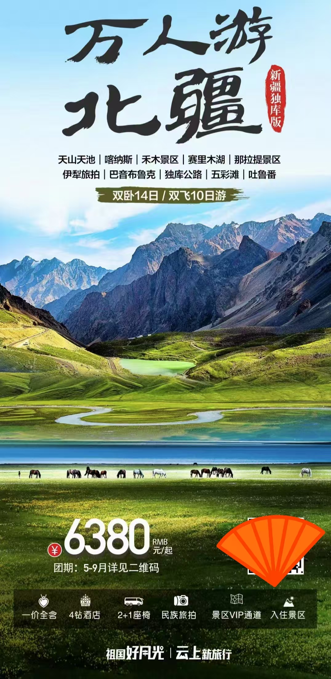 4、门票: 包含以下景点门票及首道区间车:五彩滩、天山天池、喀纳斯、禾木、赛里木湖、那拉提空中草原、喀拉峻东西草原、坎儿井