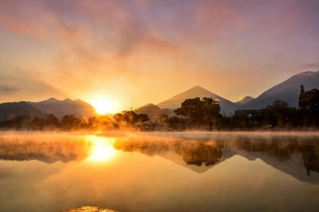 雾起的晨曦,掩映着炊烟袅袅的民居。