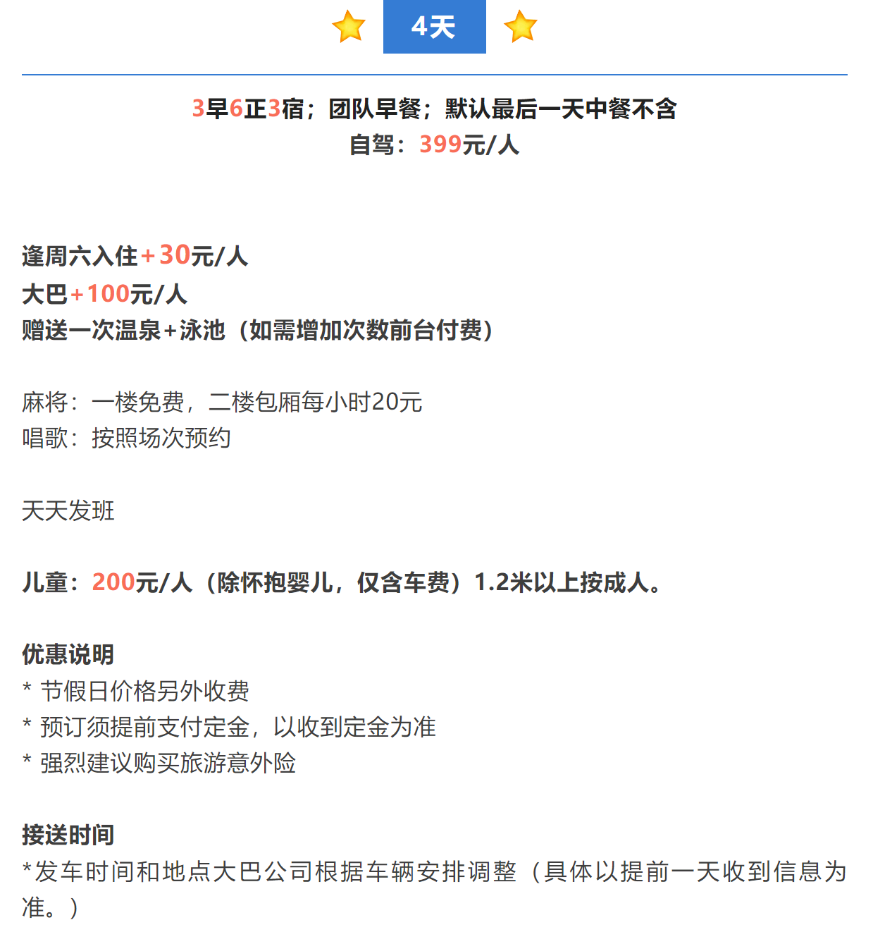 8.如需乘坐大巴,大巴接送由我方指定车辆及座位,不按团队分配车辆及座位,只保证接送至指定地点。(请务必提前抵达上车地点)