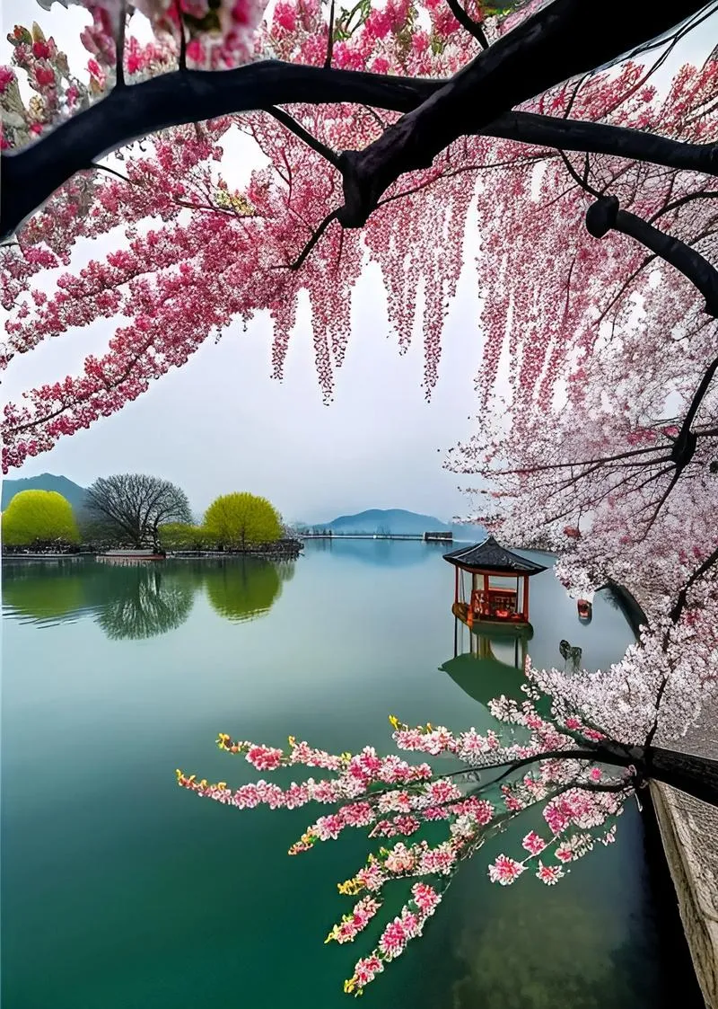 春天,湖边的柳树抽出嫩绿的新芽,桃花、樱花竞相绽放,整个西湖如诗如画;