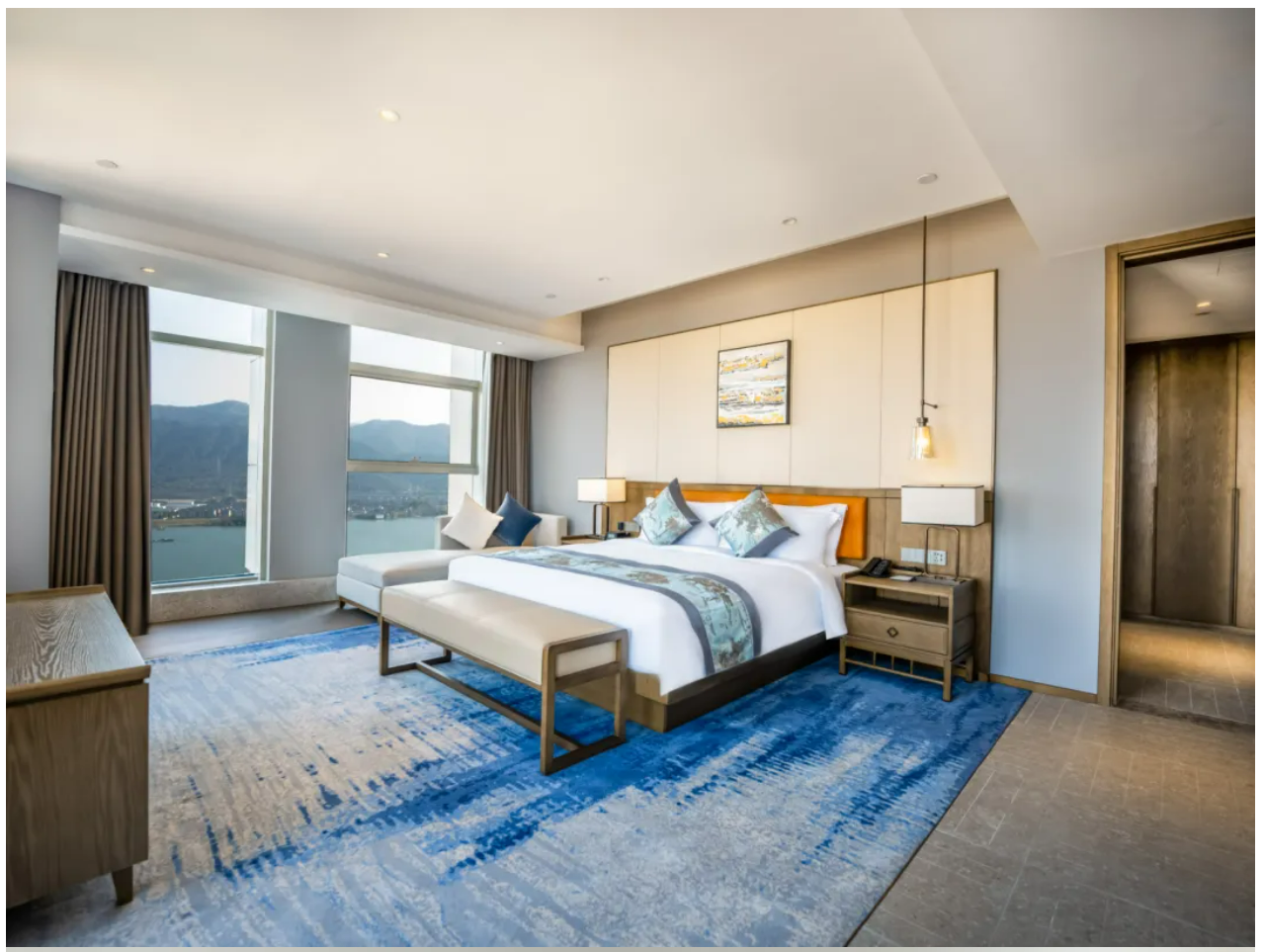 酒店地处富阳区鹿山街道,地理位置十分优越,与富春江仅百步之遥。酒店依江而立,多数客房可俯瞰富春江,风景如画,景色宜人。