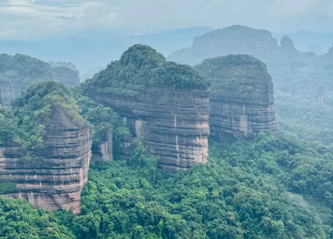 --前往参观【长老峰景区】,丹霞山的长老峰游览区由海螺峰、宝珠峰和长老峰共同构成,由三级绝壁和三级崖坎构成三个最典型的赤壁丹霞景观层次。长老峰景区最高处海拔409米,它与众多名山相比远不算高,也不算大,但它集黄山之奇、华山之险、桂林之秀一身,具有一险、二奇、三美的特点。风景区划分为上、中、下三层,上层是三峰耸峙;中层以别传寺为主体;下层以锦石岩为中心。三百多年前澹归和尚在丹霞山开辟别传寺时,曾挑出12处风景,命名丹霞十二景:锦水滩声、玉台爽气、杰阁晨钟、丹梯铁索、舵石朝曦、竹坡烟雨、双沼碧荷、乳泉春溜、累顶浮图、虹桥拥翠、片鳞秋月。在【韶音台】看丹霞山全景,这也是当年舜帝来到此地弹奏韶乐的地方