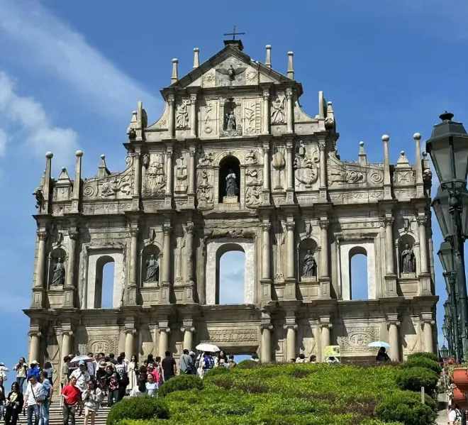 --游览澳门标志性建筑圣保罗教堂遗迹【大三巴牌坊】【大炮台】(约30分钟),大三巴是天主之母教堂(圣保禄教堂)正面前壁的遗址,这座中西合璧的石壁在全世界的天主教教堂中是独一无二的,被列入世界遗产;