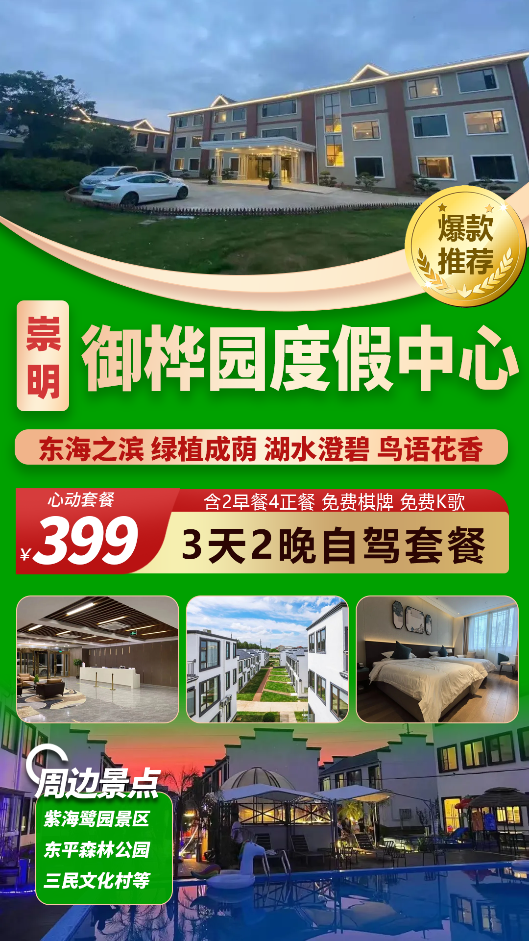 交通:自驾用餐:含2个早餐4个正餐 !住宿:崇明岛御桦园度假中心门票:景点门票需自理