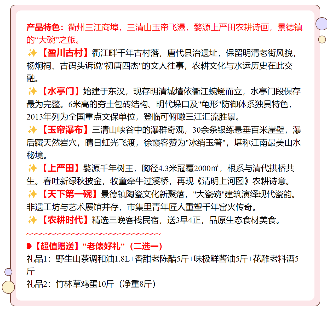 指定地点集合,车赴衢州。路上团员互相介绍熟悉,导游表演,群体小游戏,一路欢声笑语。重点前往被时光遗忘的千年码头——【盈川古村】(赠送游览,约1小时)漫步在鹅卵石铺就的唐代古驿道上,两侧夯土墙的老宅仍保留着"前店后坊"的格局。杨炯祠前的古戏台,飞檐上悬着的铜铃随风轻响,仿佛回荡着初唐诗人任县令时的判案惊堂木声。拐进榨油坊,百年木榨机正压出菜籽油的清香,而隔壁竹编老匠人手中的篾条,已编出半个鱼篓。钱塘江畔的废弃码头,青石阶上的纤绳凹痕与苔藓共生,偶有白鹭停驻。当夕阳把"盈川"石刻染成金色,整座村子便成了《清明上河图》的活态片段。