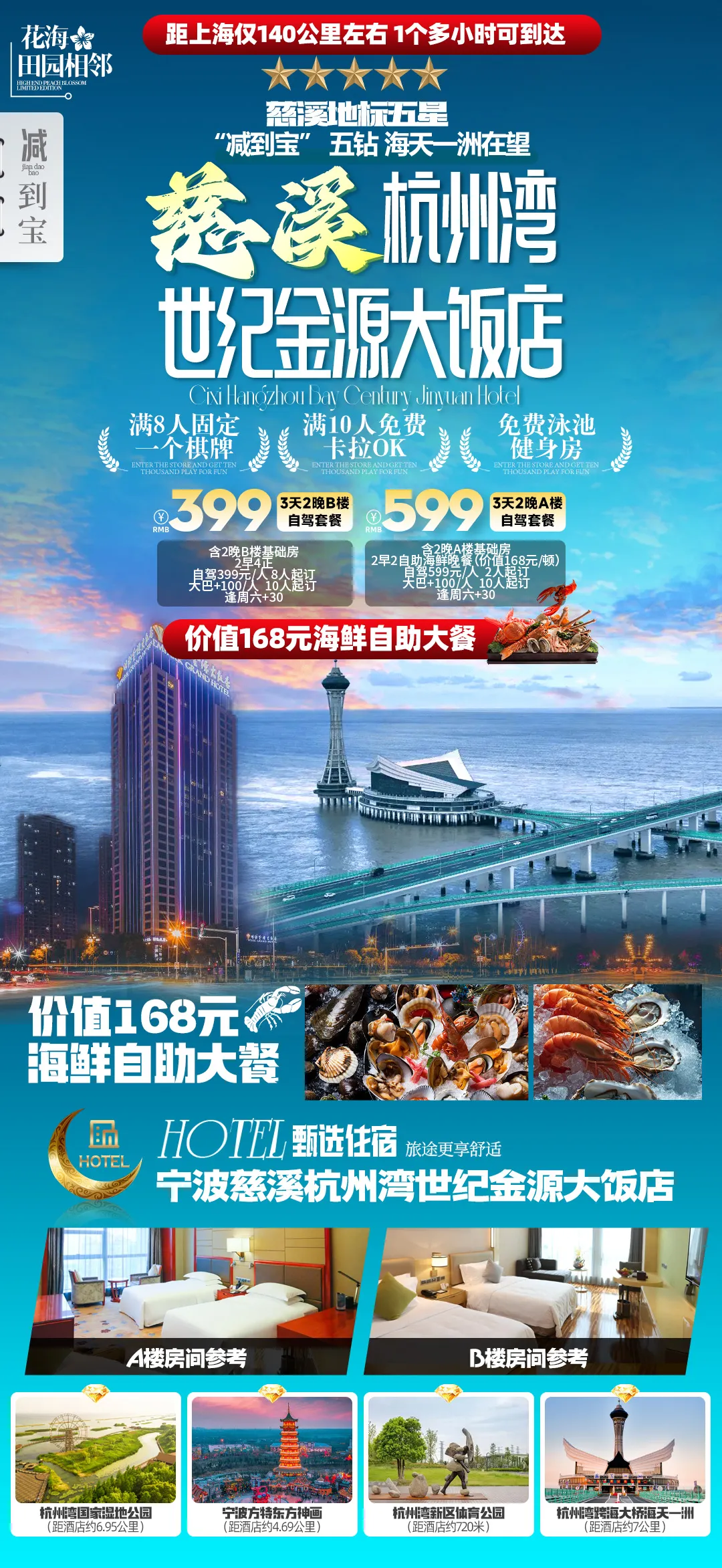 ▲住宿:2晚慈溪杭州湾世纪金源大饭店A楼/2晚慈溪杭州湾世纪金源大饭店B楼