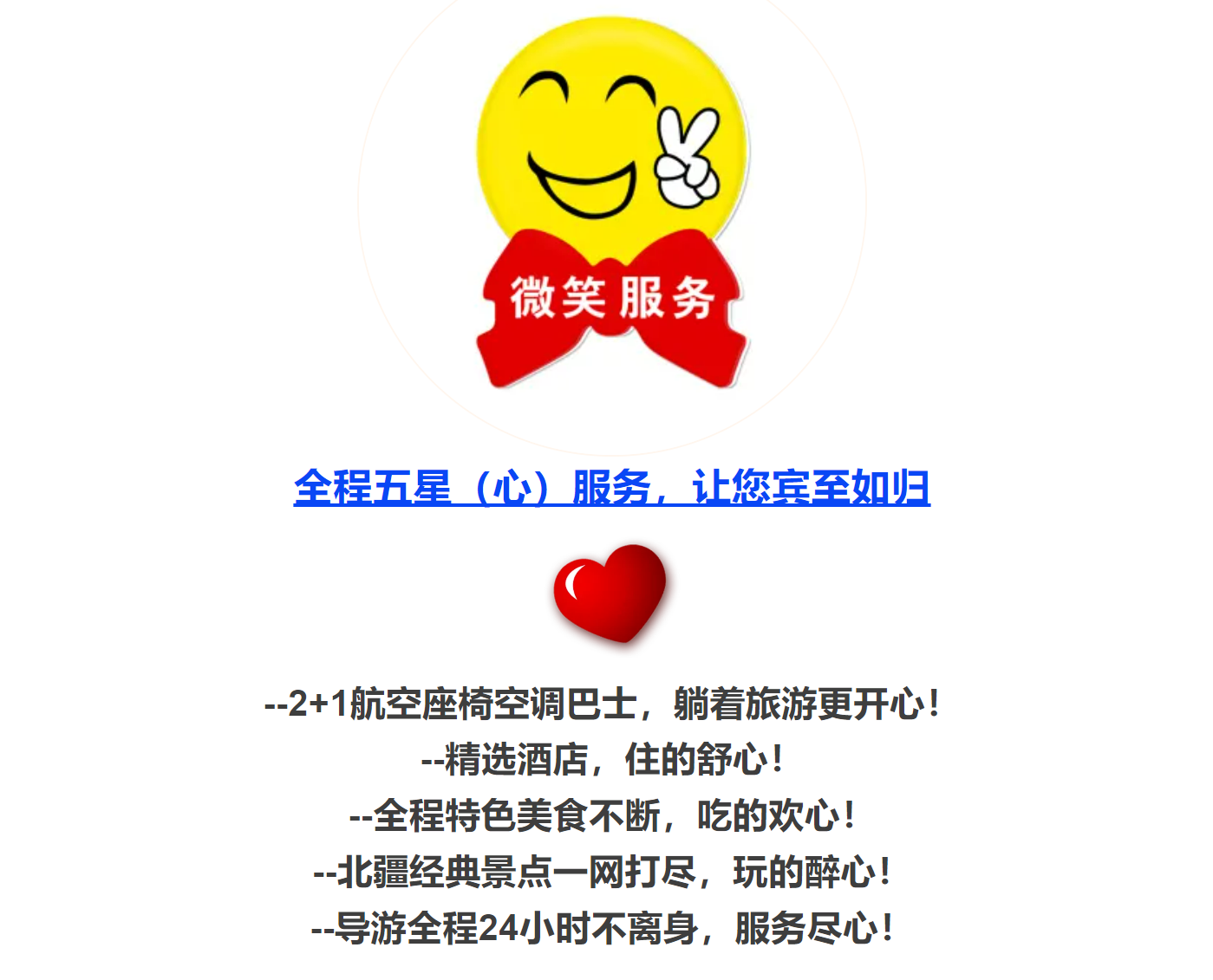 5、司机或导游可根据实际情况在不减少行程和不影响观赏性的情况下对部分景区浏览顺序进行适当调整,请谅解!