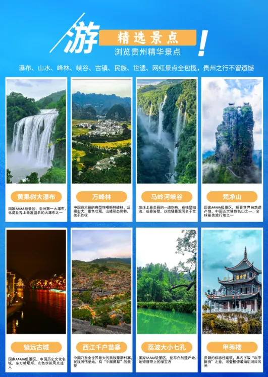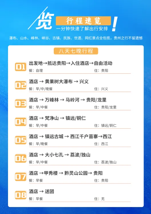 6.贵州属于高原山区,景点之间跨度较远、车程时间过长,部分景区中转交通车运力不足可能导致排队等候时间过长;请配合导游或景区工作人员的协调工作;60岁以上行动不便游客(包括孕妇)需填写景区的免责声明。