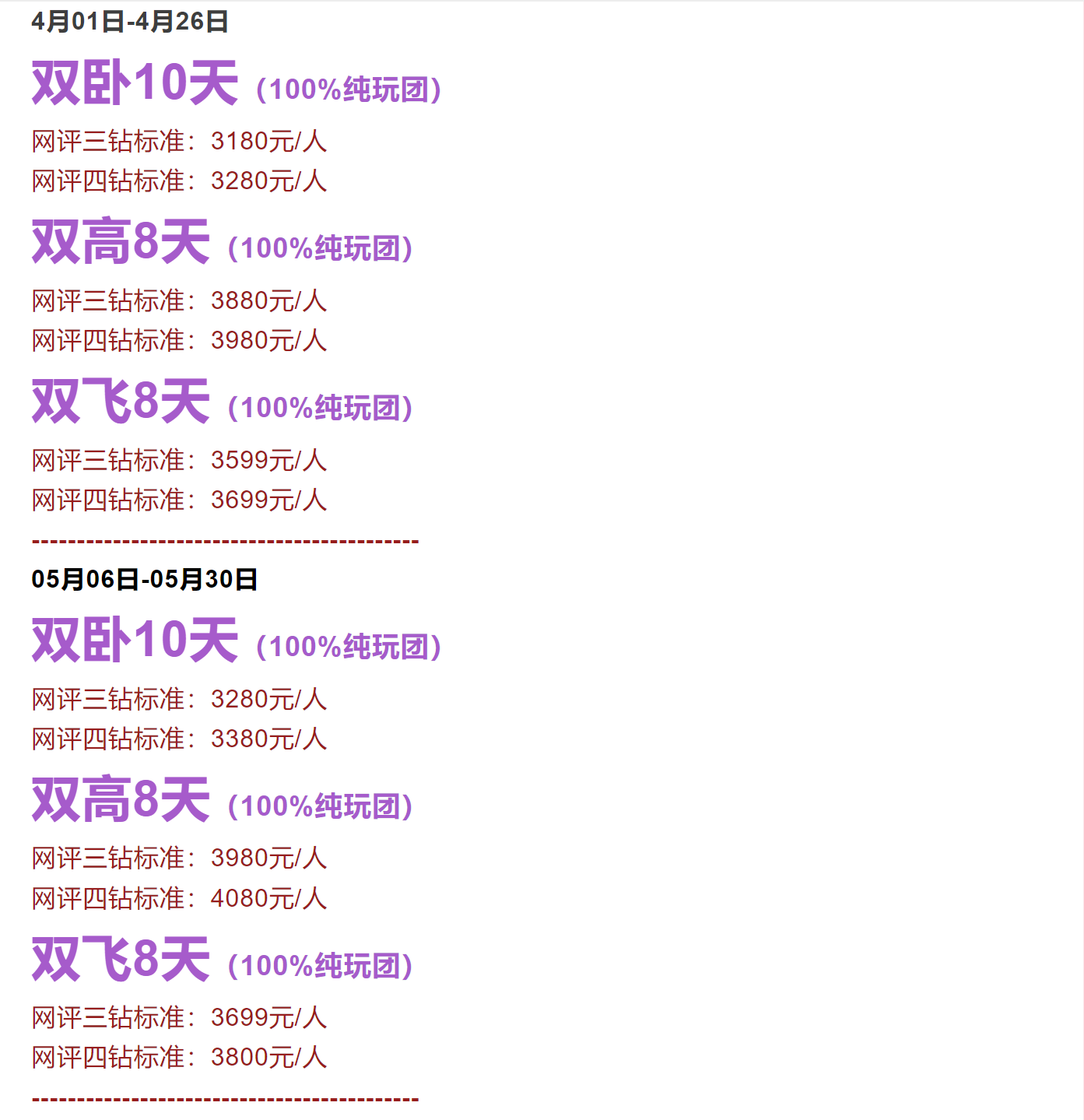3. 住宿:行程所列酒店或同级标准酒店,不提供三人间,如产生单人请自行另补单房差;